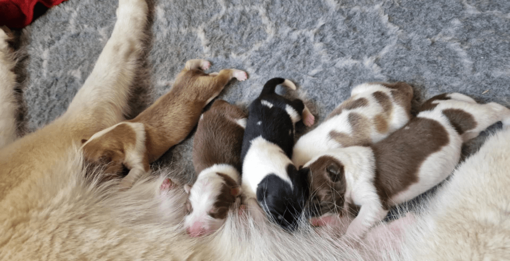 Etter flere dager med venting og flere terminer å holde seg til kom endelig 8 herlige valper til verden den 10. mai. Heilo gjorde en kjempe god jobb, å alle ble født uten noen komplikasjoner. Vil du se mer av valpene gå til Valpekull siden.